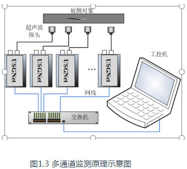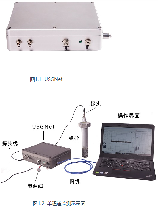 USGNet還提供了功能豐富的二次開發(fā)工具包,可自主開發(fā)應(yīng)用軟件,展現(xiàn)個(gè)性化應(yīng)力測(cè)量需求。圖1.2和圖1.3分別是單通道和多通道組合檢測(cè)連接示意圖。
