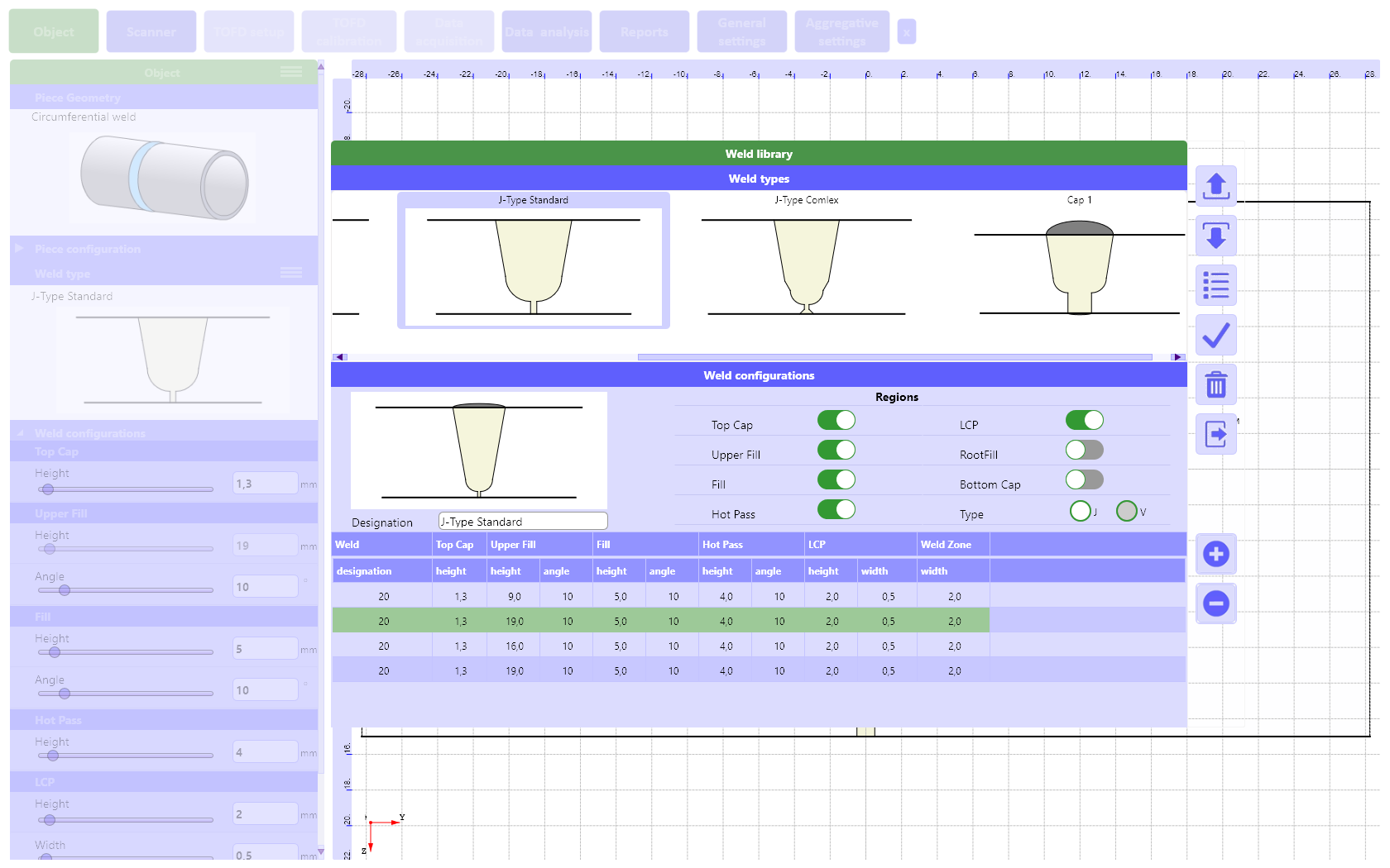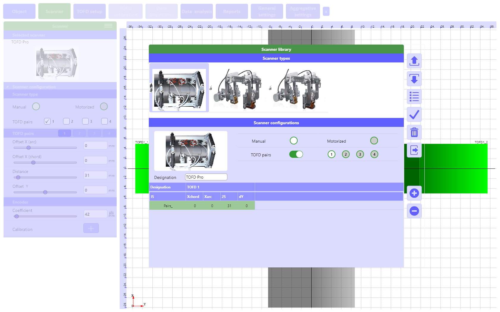 TOFD系統的軟件由一系列選項卡組成,操作員可以通過這些選項卡逐步執行設置,收集和分析數據的過程。該軟件中的操作既可以使用鼠標進行操作,也可以進行觸摸控制,因此可以在不同類型的計算機上運行-平板電腦,筆記本電腦,臺式計算機,多合一PC等。元素庫(幾何庫,材料庫,掃描儀庫,傳感器庫等)的廣泛使用大大簡化了設置過程。 因此,設置過程簡化為從庫中選擇必要的元素。為了完成單個監視任務,可以隨時保存并加載合適的完整配置包。