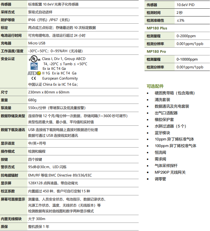 美國MPOWER MP180 Plus & MP180 Pro 便攜式 VOC檢測儀 產(chǎn)品參數(shù):