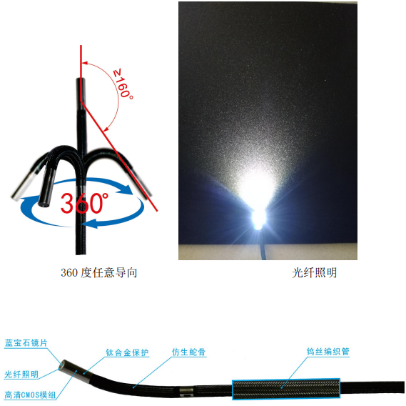 ● 探頭 探頭采用精密機械式操控導向,360度任意旋轉;實現探頭與操控搖桿同步擺動,沒有任何延遲。導向機構有遇障礙過載保護功能,能有效的避免牽引導線拉斷。