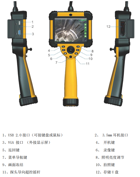 WS-Y 系列是基于 Windows 基礎上研發而成的完全智能化的高端工業內窺鏡; 機身內存最大可擴充至 512GB。外部有 2 個 USB 接口,用于插 U 盤存儲和鍵盤鼠標 對文件進行編輯操作;1 個 3.5mm 音頻接口,可錄制語音視頻;1 個 VGA 接口,外 接大顯示屏同步顯示。探頭采用精密機械式操控導向,360 度任意旋轉,搖桿與探 頭同步擺動可實現精準導向,0 延遲。顯示采用工業級高清高亮觸摸式顯示屏;智 能軟件可自定義設定存儲路徑和編輯文件重命名,并且可對文件夾進行復制、移 動、刪除等操作。圖像處理功能可實現拍照、錄像、比例縮放、畫面凍結、圖像 翻轉、負片、動態注釋、照片在線編輯、涂鴉注釋、郵戳注釋、文字注釋;自定 義編輯錄像自動保存時間。
