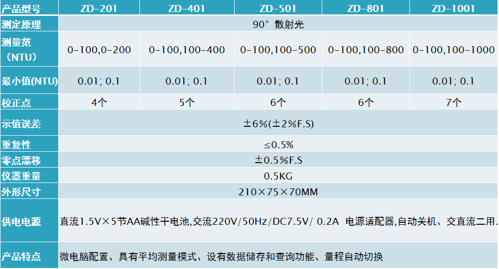 齊威 ZD系列微機型便攜式濁度儀 產品參數: