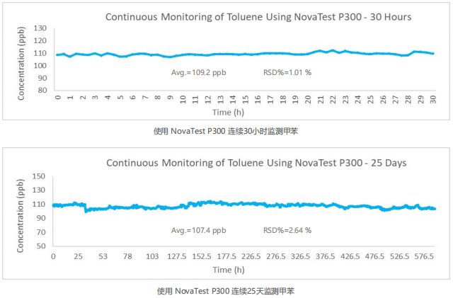 NovaTest P300采用世界領(lǐng)先的美國微流專*技術(shù)、MEMS設(shè)計, 峰形好、半峰寬窄,相比于傳統(tǒng)GC大大縮短了分析時間。同 時,P300支持連續(xù)測試,客戶可根據(jù)應(yīng)用需求設(shè)定任意測試頻率,連續(xù)監(jiān)測分析VOC混合物。下列結(jié)果為30小時和25天對甲苯的 連續(xù)測試數(shù)據(jù),每30分鐘進(jìn)行一次測試。
