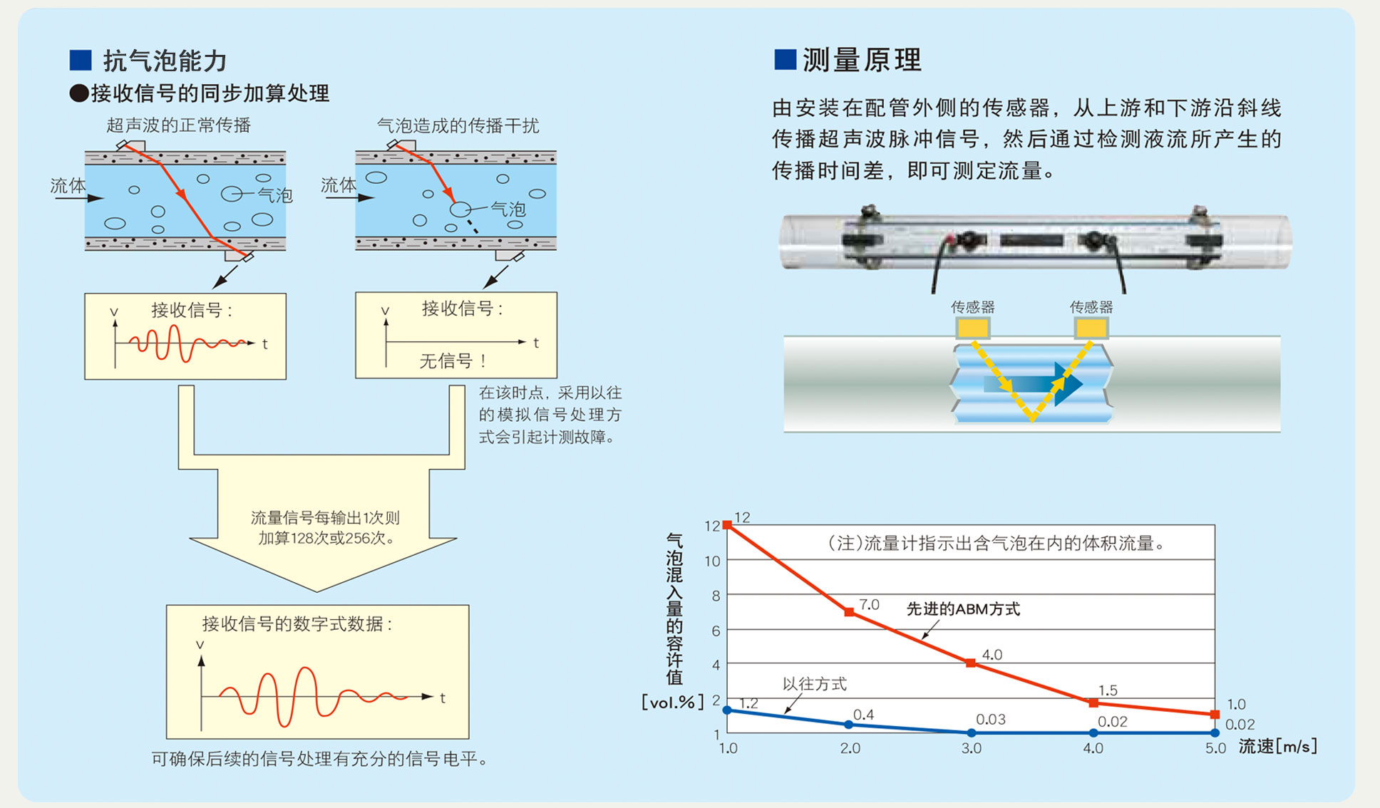 富士FLR超聲波流量計耐氣泡性優(yōu)越,最適合機械裝置配套使用的小型變換器。 可以測量從配管口徑φ25~φ1200mm的液體流量。