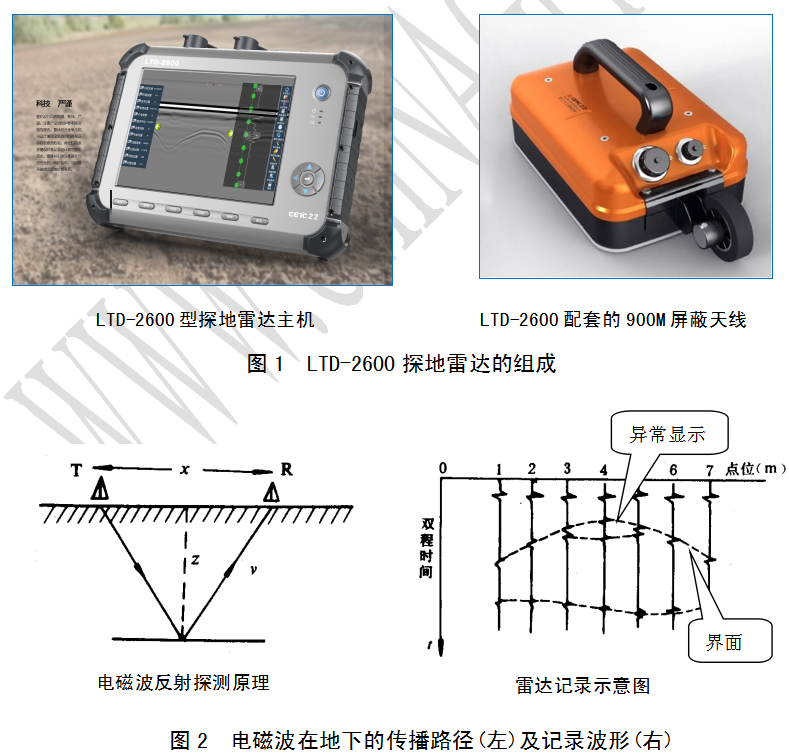 LTD探地雷達由一體化主機、天線及相關配件組成(圖1)。針對探地雷達所用的高頻電磁脈沖而言,通常工程檢測和勘探中所遇到的介質都是以位移電流為主的低損耗介質。在這類介質中,反射系數和波速主要取決于介質的介電常數ε,空氣的相對介電常數為1,最?。凰南鄬殡姵禐?1,最大。雷達工作時,向地下介質發射高頻電磁脈沖(幾十兆赫至上千兆赫),電磁脈沖遇到不同電性介質的分界面時即產生反射或散射,探地雷達接收并記錄這些信號,再通過進一步的信號處理和解釋即可了解地下介質的情況(圖2)。