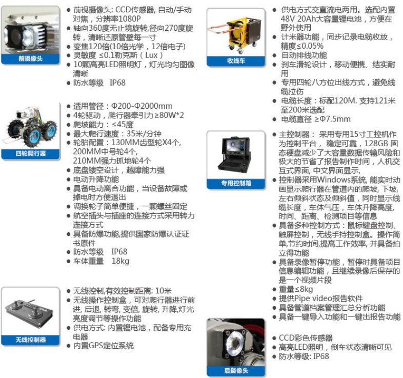 該系列爬行機器人檢測系統,是以智能輪式運動機構作為搭載平臺,配備工業級高分辨率彩色攝像單元、運動姿態檢測單元和智能控制影像錄制處理終端,輔助強力照明光源和線纜卷收裝置的高科技檢測專用產品,可以根據應用場所需求,搭載熱成像儀、聲納、機械手、樹根切割機、毒氣檢測儀等等傳感器或專用工具,實現對各種隱蔽空間、水下、易燃、易爆、輻射等高危場所進行實時影像檢測、分析處理。