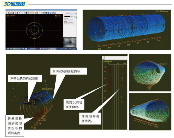 ?全景3D圖像顯示,從各個角度顯示管道的管徑、管壁、浮泥高度、管底硬高度泥等信息。管道輪廓成像、3D圖像任意旋轉、透視、縮放??捎糜谂袛喙艿雷冃?、孔洞、支管稀泥及硬質沉積物厚度。
