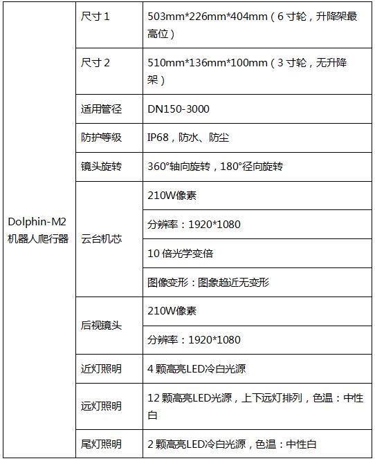 管網(wǎng)檢測(cè)機(jī)器人DOLPHIN-M2 產(chǎn)品參數(shù):