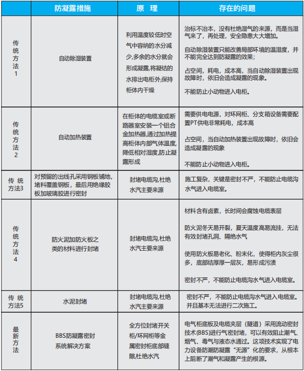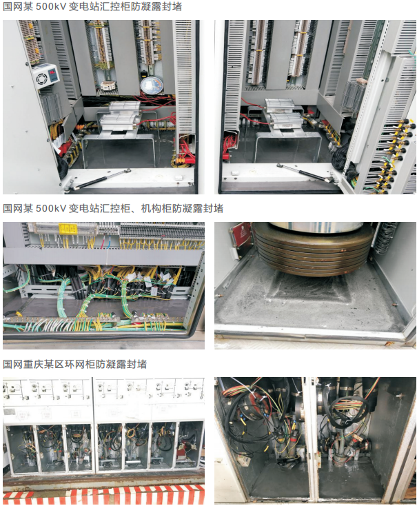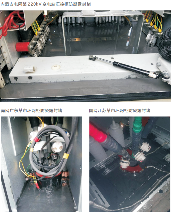 在電網設備中,環網柜、開關柜、端子箱等室內外電氣柜受潮、形成凝露等危害十分嚴重,過去采用的除濕器、加熱器等有源方法存在各種各樣的問題,治標不治本。原始的封堵方法也存在很多問題。“無源化”的電力設備防潮防凝露治理方案成為一種新型解決方案,在實際應用中效果明顯,填補了國際和國內在此領域的技術空白。在電氣柜底板及電纜夾層(隧道)進行氣密封堵,將電纜周圍的孔洞、縫隙進行密封處理,氣體無法穿越結構件的密封,可以有效阻止潮氣、煙氣、毒氣與液態水通過,從根本上阻斷了潮氣和凝露產生的源頭。