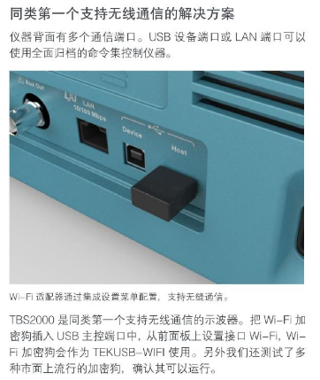 TBS2000是第一款通過USB Wi-Fi加密狗提供Wi-Fi支持的示波器。 其還具有2個USB主控端口和1個滿足LXI標準的100-BaseT以太網(wǎng)端口,使與您的實驗室合作伙伴或在全球范圍內(nèi)共享測量和協(xié)作變得很容易。 另外,其包含的軟件可讓您輕松連接到您的PC,以抓取屏幕圖像和分析數(shù)據(jù)。