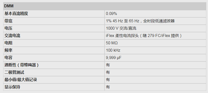 ?共有 15 種測量功能,其中包括:交流電壓(有低通濾波器)、直流電壓、電阻、導(dǎo)通性、電容、二極管檢測、最小值/最大值/平均值、交流電流(通過 iFlex柔性電流探頭)、頻率