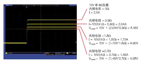 使用可編程內部電阻,仿真電池的輸出。在這個例子中,Model 2260B-80-13 電源仿真一塊 10V 電池,其內部電阻是0W、0.9W、1.8W 和2.7W。由于經過電池內部電阻的電壓下跌,輸 出端子上得到的電壓從10V 下跌到5.98V。