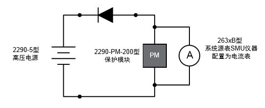 利用吉時(shí)利數(shù)字源表源測(cè)量單元儀表對(duì)高壓二極管進(jìn)行反向擊穿測(cè)試,以測(cè)試漏電流。當(dāng)二極管擊穿時(shí), 2290-PM-200 SMU型保護(hù)模塊對(duì)數(shù)字源表源測(cè)量單元儀表進(jìn)行保護(hù),使之免遭高壓損害。