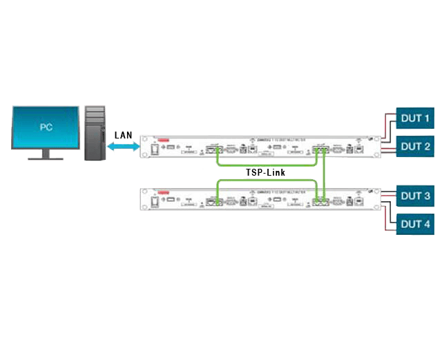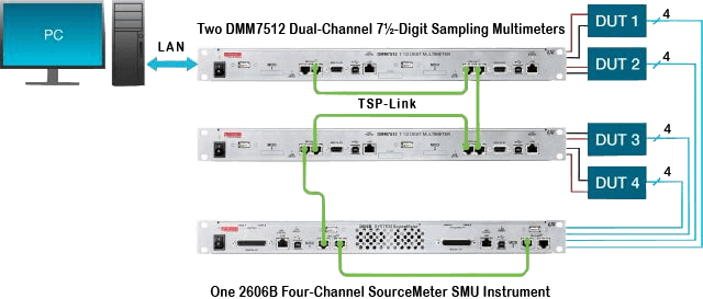 每臺 DMM7512 中的兩個 DMM 具有內置智能,可以使用其測試腳本處理器 (TSP?) 技術在無需 PC 交互的情況下執行測試程序。此外,每個 DMM 都具有 TSP-Link? 硬件接口,因此一臺儀器可以控制主從配置中的其他儀器。