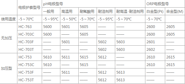 | 排水中和控制監(jiān)控用 | HC-763型 | HC-753型 | ?采用半透明的PP(聚丙烯)材質(zhì)的護(hù)套,具有耐熱、耐藥性。 |