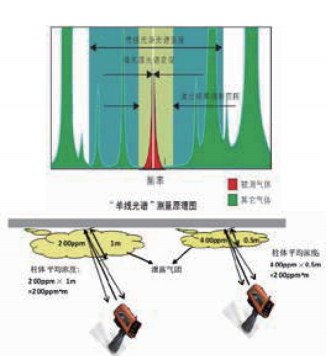 當激光器向測量區(qū)域(如管道,天花板,墻體,地面等)發(fā)射特定波長的光束,同時檢測從測量點反射回來的激光光譜,即可測量分布于設(shè)備與測量點路徑之間的甲烷氣體平均濃度,測量值以甲烷柱體平均濃度(ppm*m)表示:甲烷氣體濃度(ppm)×泄漏氣團厚度(m)。