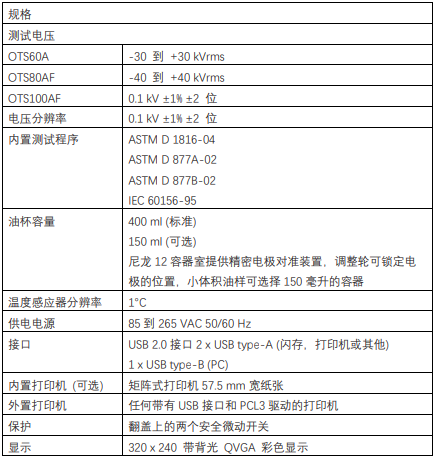 SebaKMT賽巴 美國MEGGER OTS100AF/OTS80AF/OTS60AF實驗室絕緣油耐壓測試儀產品參數:
