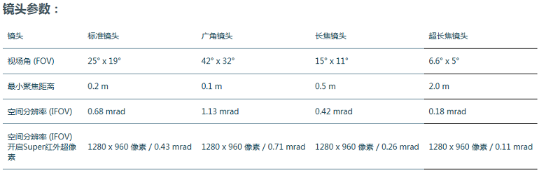 可選配4種鏡頭,滿足不同測量需求:標(biāo)準(zhǔn)鏡頭(25° x 19°),廣角鏡頭(42° x 32°),長焦鏡頭(15° x 11°),超長焦鏡頭(6.6° x 5°)