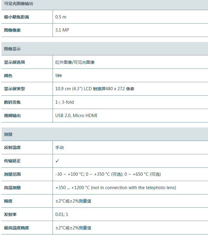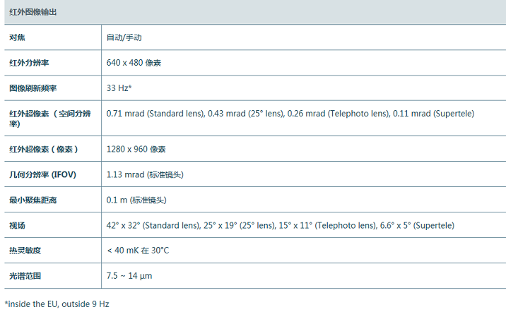 紅外分辨率 640 × 480 像素;采用SuperResolution紅外超像素技術(shù)后,可提升至 1280 × 960 像素;熱靈敏度< 40 mK