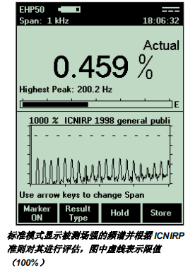 – 內(nèi)置公眾安全標(biāo)準(zhǔn)限值,在確知頻率的情況下,測量結(jié)果可以直接顯示為“百分比標(biāo)準(zhǔn)”(見圖)