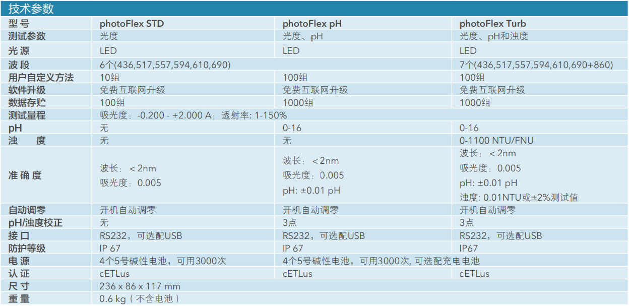 賽萊默XYLEM photoFlex 系列便攜比色計產品技術參數: