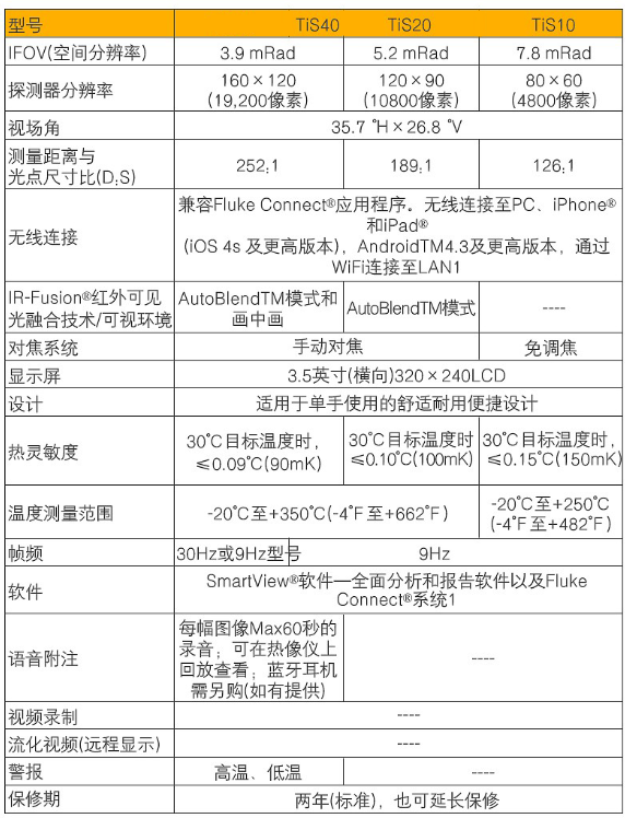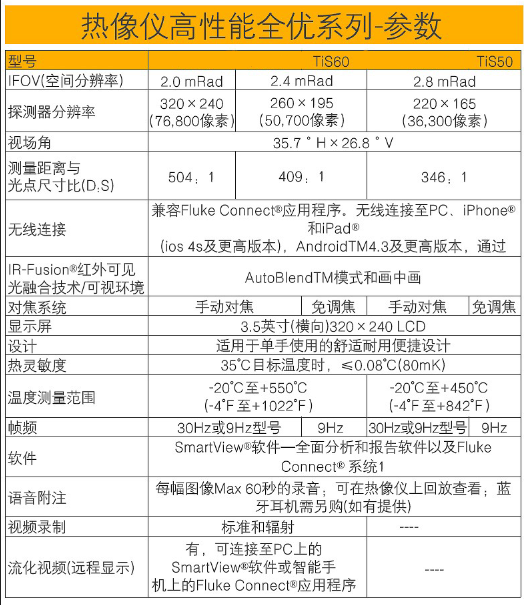 美國Fluke TiS60/50/40/20/10 紅外熱像儀 相關(guān)參數(shù):