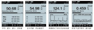 標準模式 – 顯示測量值與所選安全標準參考限值的 % XYZ 模式 – 同時顯示三方向同步測量值