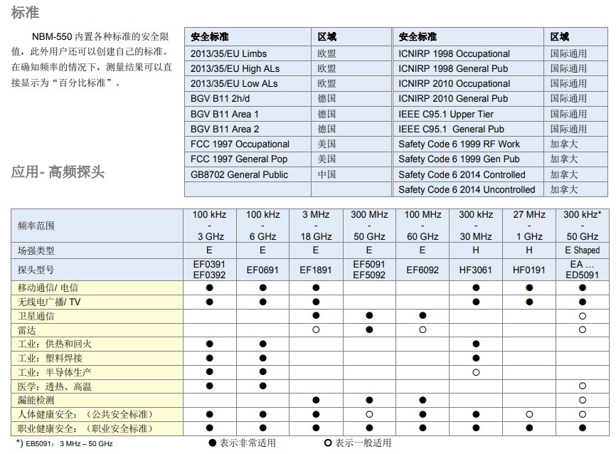 寬頻電磁輻射分析儀 NBM-550 從屬于 NBM-500 系列,能極其準確地測量電磁輻射。探頭覆蓋了從 工頻到微波輻射的所有頻率,通過配備不同類型的探頭可以測量電場、磁場強度,同時配備有普通探頭 和其他基于人體安全標準的計權類型探頭,這些探頭均通過獨立校準,并且使用非揮發性存儲器存儲探 頭參數和校準參數。因此,探頭可以用于任何一款 NBM-500 系列儀器上而不會對校準準確度有任何影響。