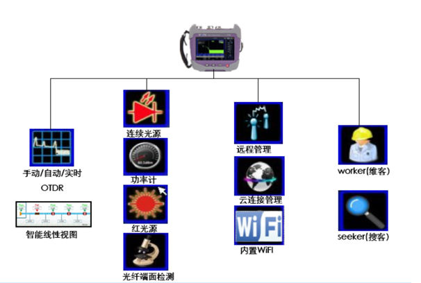 - 集成了光纖測試必備的所有功能:線性視圖(標配) VFL(標配) 光源(標配)WORKER(維客) SEEKER(搜客)