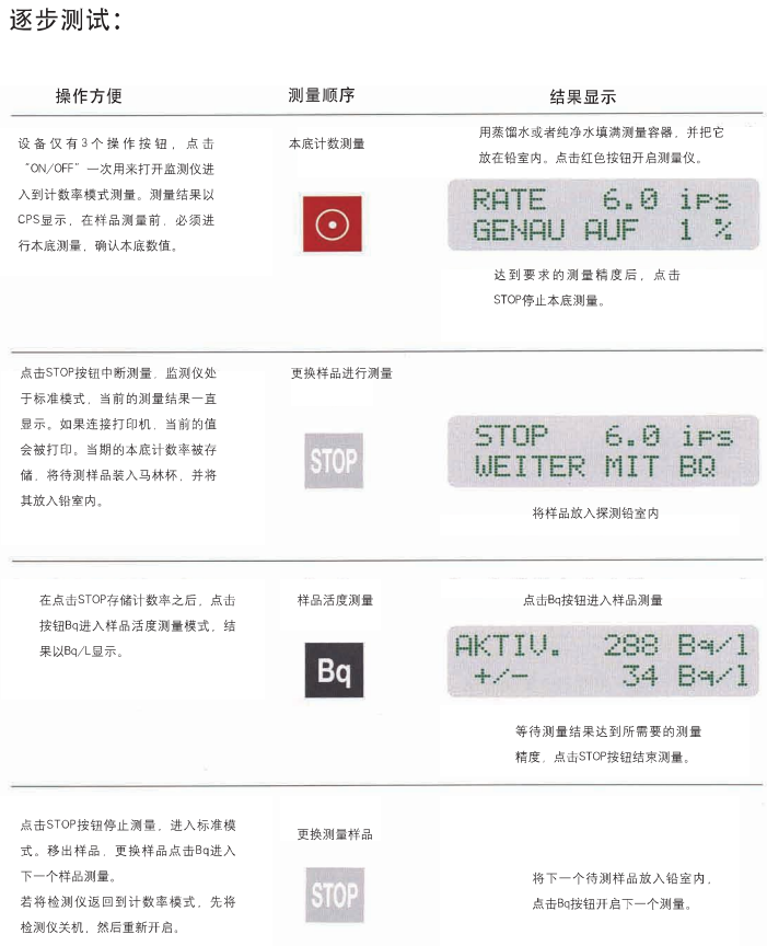 測量結果單位顯示為cps或者經設備計算轉換后為Bq/l內置的微處理器系統(tǒng)程序保證當測量數據變換后,顯示數據會自動調節(jié)。