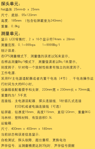微處理電子學單元允許非專業(yè)人員進行直接探測液態(tài)和顆粒物中的伽馬放射性濃度,樣品活度的最低下限為20Bq/L或者20Bq/Kg,約為0.5nCi/L