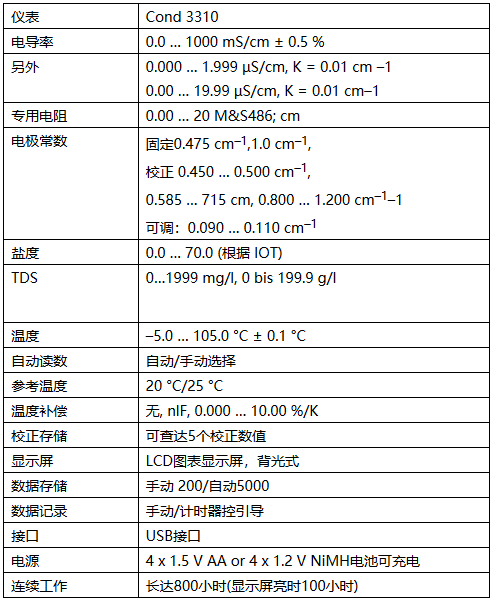 德國WTW Cond3310型便攜電導(dǎo)率儀set1產(chǎn)品技術(shù)參數(shù):