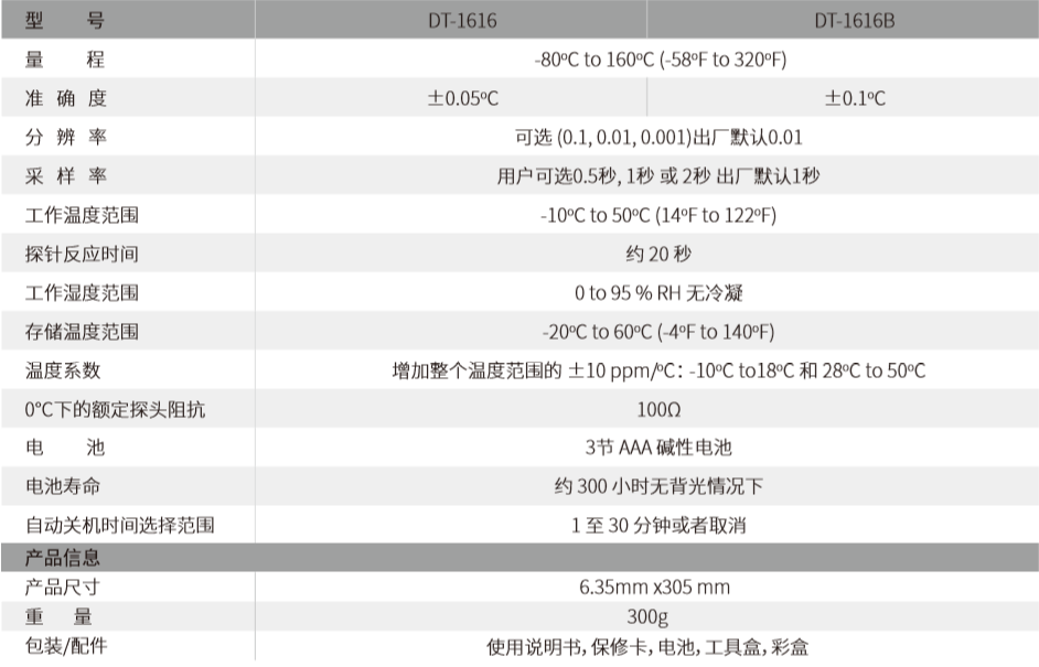 兩種精度可選:±0.05°C(DT-1616)/±0.1°C(DT-1616B)