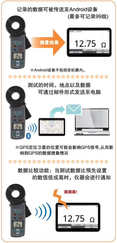 ●測(cè)量數(shù)據(jù)可被顯示并保存至Android設(shè)備上(可記錄99組數(shù)據(jù))