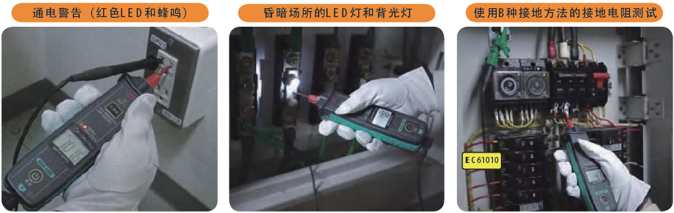 ●30V以上的電壓檢測的通電警告(測試鍵按下后可測試對地電壓)。